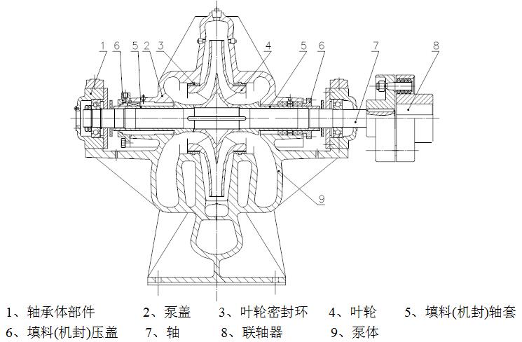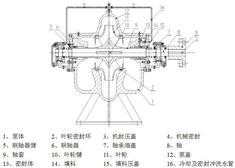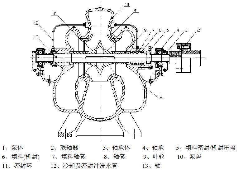 泵為臥式安裝,泵殼水平中開,上部為泵蓋,下部為泵體,吸入口和吐出口均在軸心線下方,檢修時(shí)不必拆卸進(jìn)出水管路,只要揭開泵蓋,即可取出轉(zhuǎn)子部件。