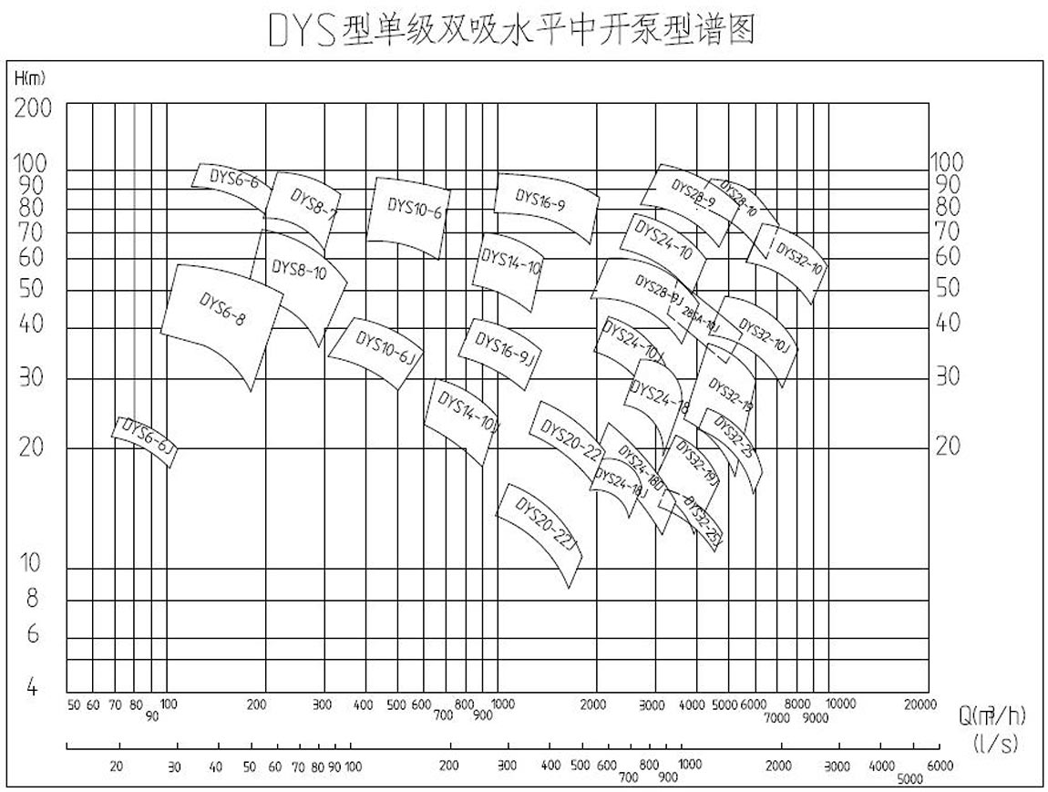 DYS 型泵設(shè)計(jì)有41種型號(hào),通過切割,降速及變型葉輪可派生出161個(gè)基本規(guī)格,在型譜性能范圍內(nèi),可提供用戶需要的滿足任意性能參數(shù)要求的單級(jí)雙吸離心水泵。